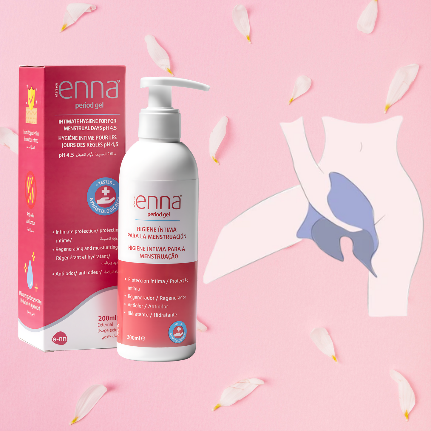 Enna Period Gél je vďaka svojmu prírodnému zloženiu jedinečný intímny umývací gél určený na hygienu ženských partií v období menštruácie. Je bez mydla a obsahuje kyselinu mliečnu a rastlinné výťažky, ktoré majú upokojujúce účinky na intímne partie, rešpektujú pH intímnej oblasti a slizníc.
